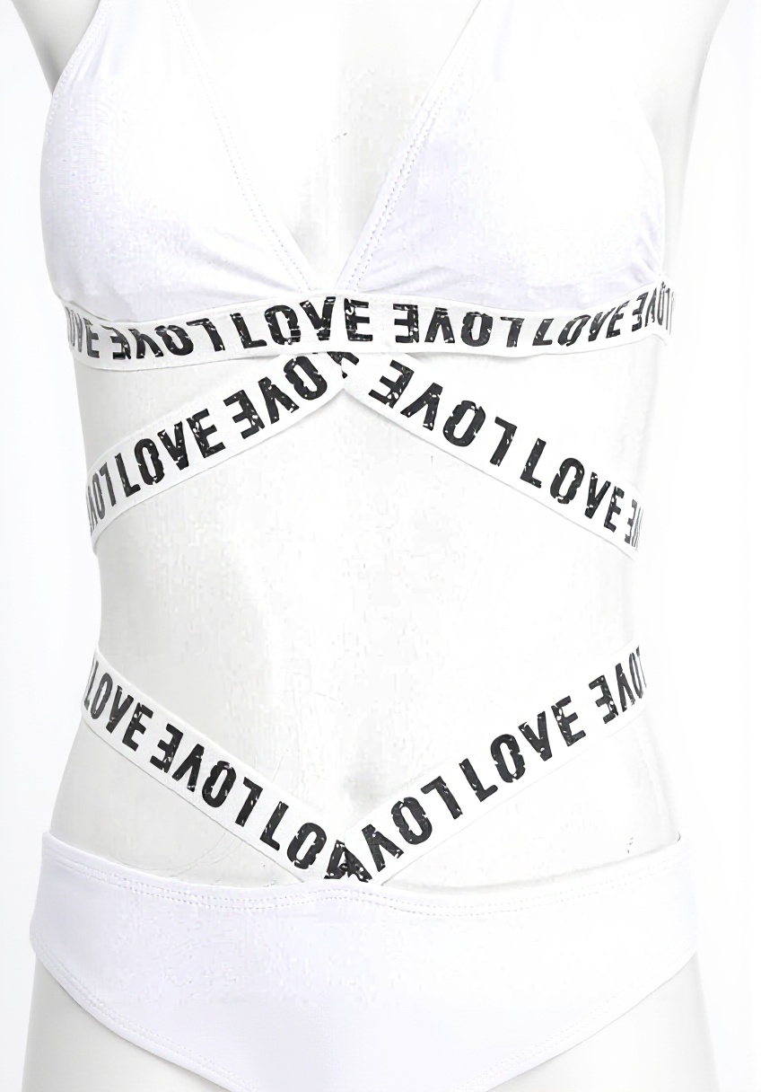 Découvrez ce maillot de bain deux pièces pour femmes avec design bandage croix et impression lettre. Matière élastique légère, confortable et séchage rapide.