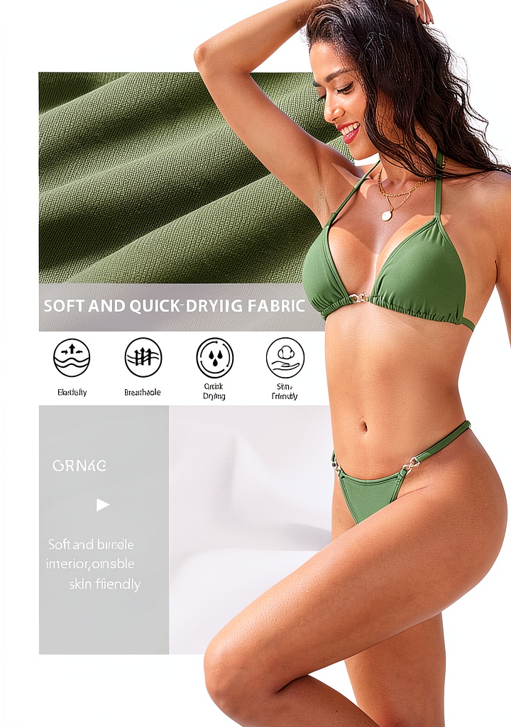 Le maillot de bain 2 pièces Yuson Girl est conçu pour offrir style et confort. Composé de 82% nylon et 18% élasthanne, ce bikini est doux, respirant et opaque, avec un séchage rapide. Le haut push-up réglable et le string bas créent une silhouette flatteuse, adaptée à différentes morphologies. Disponible en tailles XS à L et couleurs variées comme Vert Armée, Bleu Clair, Noir, Bleu et Burgundy.